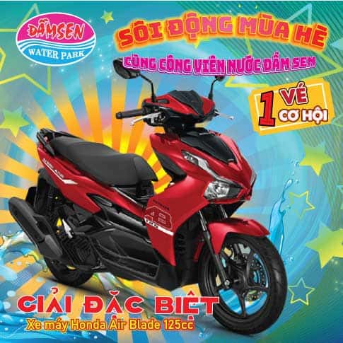Tham gia chương trình quay số trúng thưởng tại Đầm Sen Nước để có cơ hội nhận được những phần quà giá trị như xe Air Blade125, Smart Tivi, và robot hút bụi. Chỉ cần mua vé vào cổng, bạn đã có thể tham gia quay số và thử vận may của mình (bằng cách lên web điền thông tin của bạn vào hệ thống của chúng tôi). Hãy đến và trở thành người may mắn nhất!
